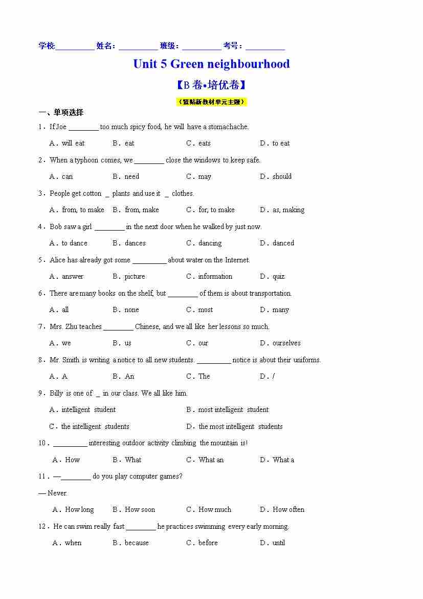 Unit 5 Green neighbourhood (B卷·培优卷)(学生版)