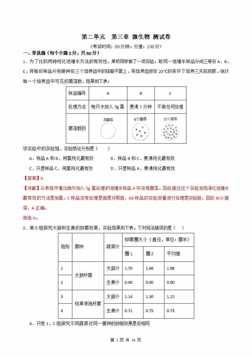 首页 > 全部 > 单元检测 > 第2单元 第3章 微生物【单元卷·测试卷】(解析版)
