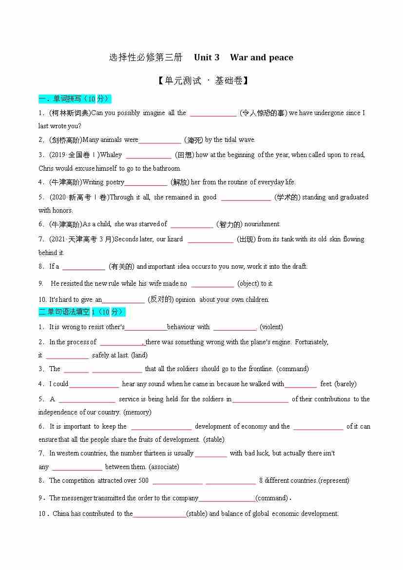 选择性必修第三册 Unit3(单元测试 · 基础卷)(外研版2019)(学生)