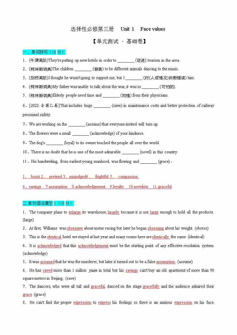 首页 > 全部 > 单元试卷 > 选择性必修第三册 Unit1(单元测试 · 基础卷)(外研版2019)(教师)