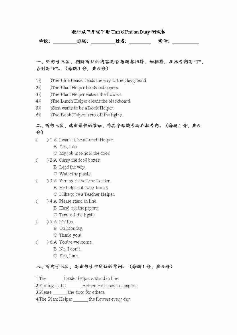 教科版三年级下册Unit 6 I’m on Duty测试卷(含听力音频,听力文本和答案)