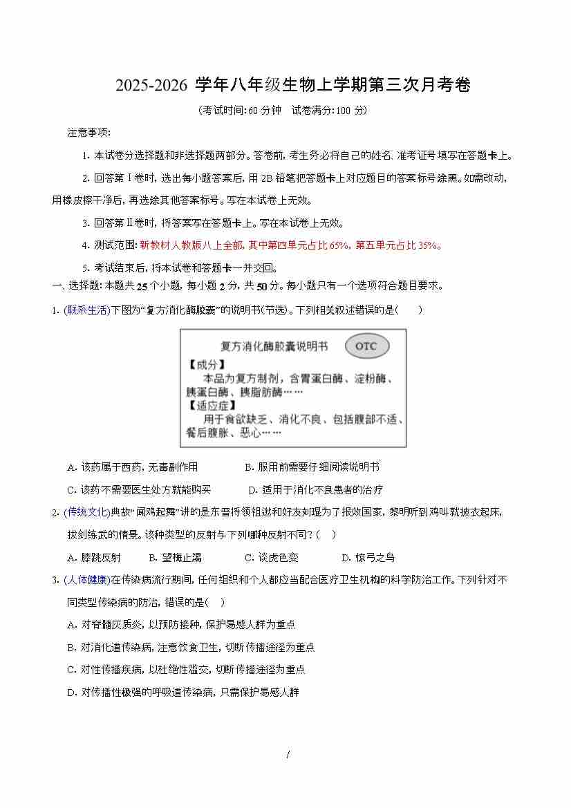 首页 > 全部 > 月考试卷 > 八年级生物第三次月考·重难突破卷(新教材人教版)(考试版)