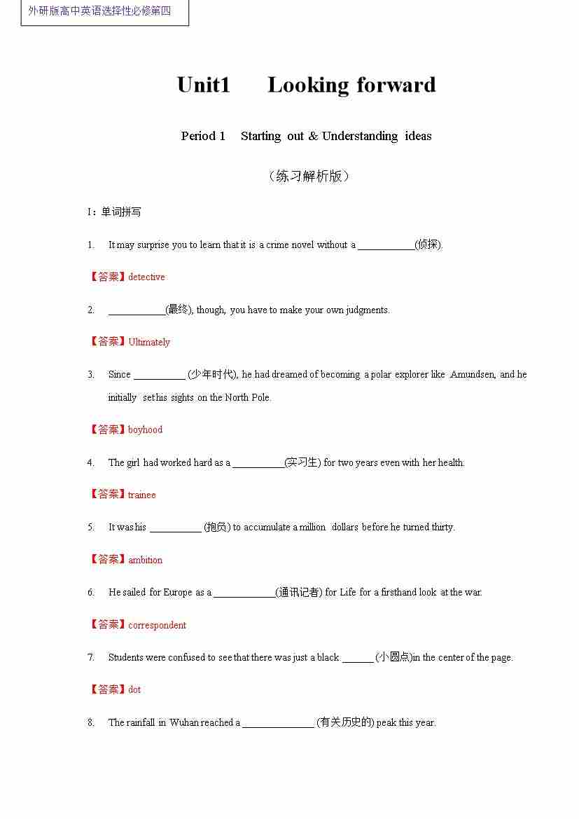 Unit 1 Looking forwards Period 1 Starting out and understanding ideas 练习(解析版)-(外研版选择性必修第四册