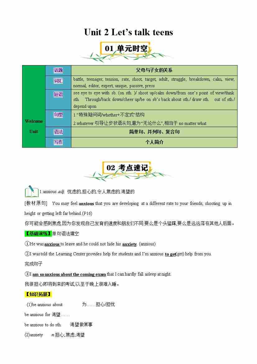 首页 > 全部 > 知识清单 > Unit 2 Let’s talk teens(知识清单)(教师版)-(译林版2020必修第一册)