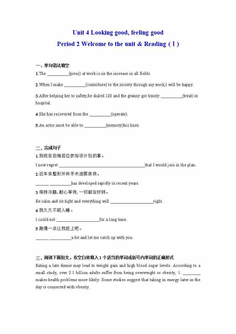 首页 > 全部 > 分层作业 > Unit 4 Looking good, feeling good Period 2 Welcome to the unit & Reading (Ⅰ) (分层练习)(原卷版)---(译林版2020必修第一册)