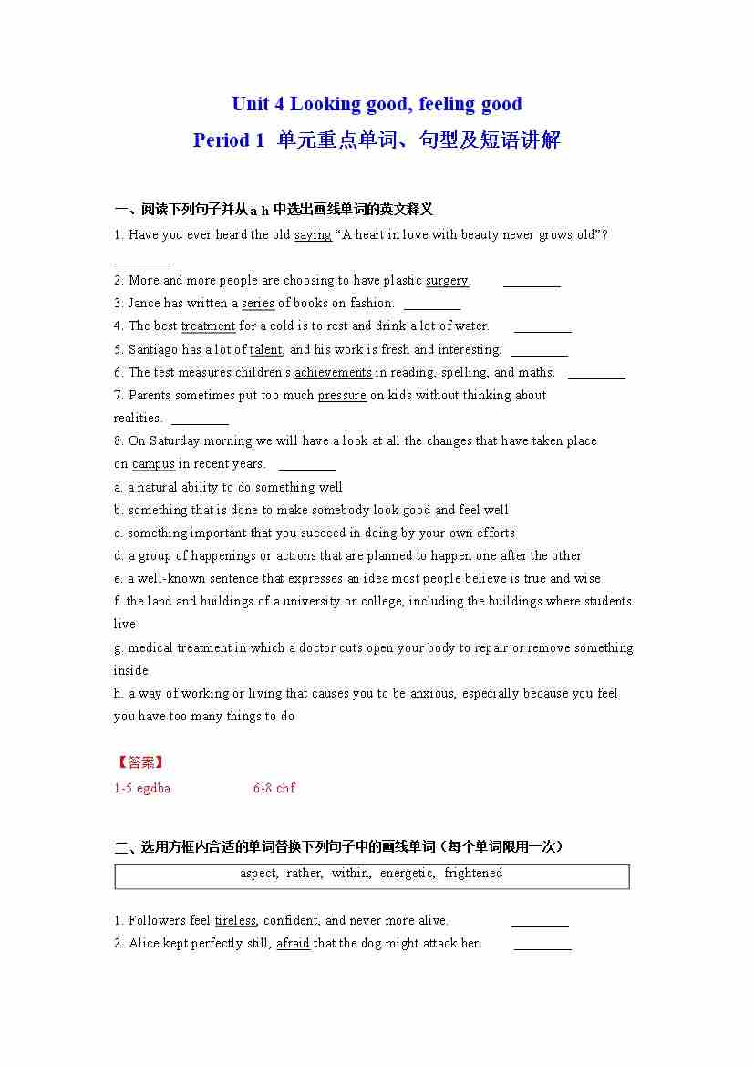 首页 > 全部 > 分层作业 > Unit 4 Looking good, feeling good Period 1 单元重点单词、句型及短语讲解(分层练习)(解析版)---(译林版2020必修第一册)