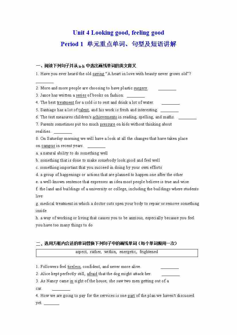 首页 > 全部 > 分层作业 > Unit 4 Looking good, feeling good Period 1 单元重点单词、句型及短语讲解(分层练习)(原卷版)---(译林版2020必修第一册)