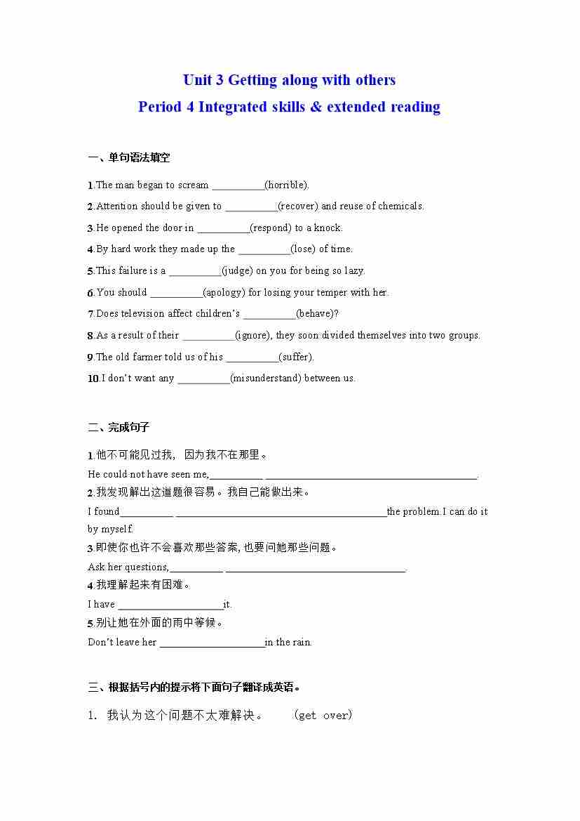 首页 > 全部 > 分层作业 > Unit 3 Getting along with others Period 4 Integrated skills & extended reading (分层练习)(原卷版)---(译林版2020必修第一册)
