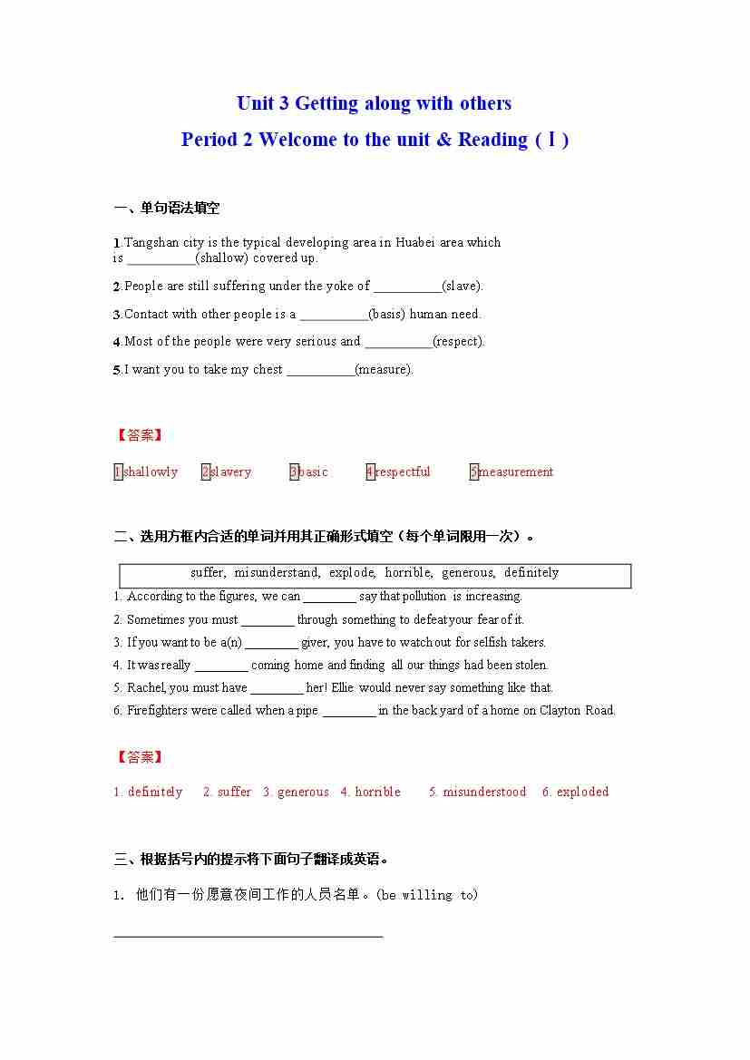 首页 > 全部 > 分层作业 > Unit 3 Getting along with others Period 2 Welcome to the unit & Reading (Ⅰ)(分层练习)(解析版) ---(译林版2020必修第一册)