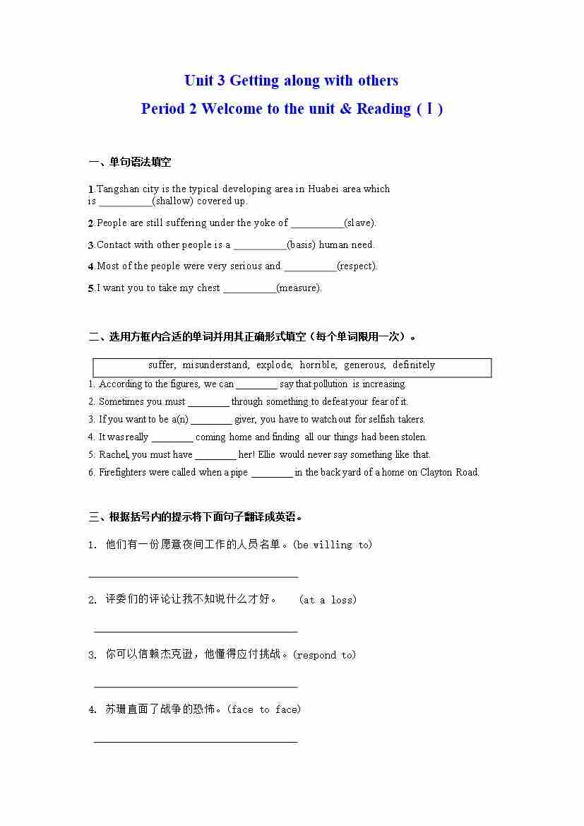 首页 > 全部 > 分层作业 > Unit 3 Getting along with others Period 2 Welcome to the unit & Reading (Ⅰ)(分层练习)(原卷版) ---(译林版2020必修第一册)