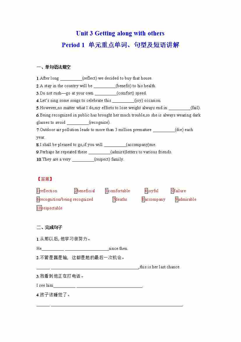 首页 > 全部 > 分层作业 > Unit 3 Getting along with others Period 1 单元重点单词、句型及短语讲解(分层练习)(解析版)---(译林版2020必修第一册)