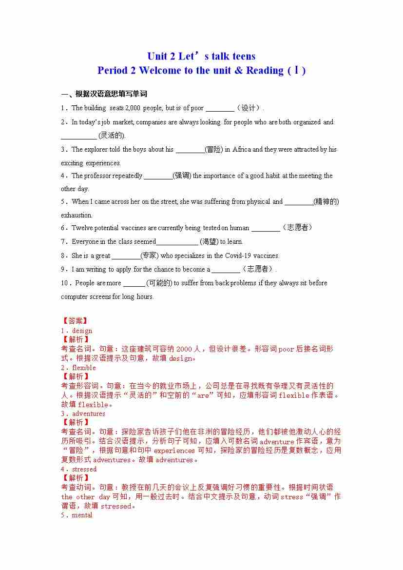 首页 > 全部 > 分层作业 > Unit 2 Let’s talk teens Period 2 Welcome to the unit & Reading (Ⅰ) (分层练习)(解析版)---(译林版2020必修第一册)