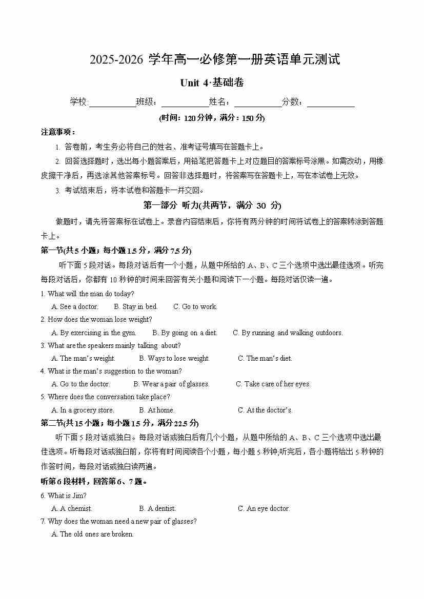 首页 > 全部 > 单元测试 > 高一英语必修第一册Unit 4 单元测试·基础卷(考试版A4)