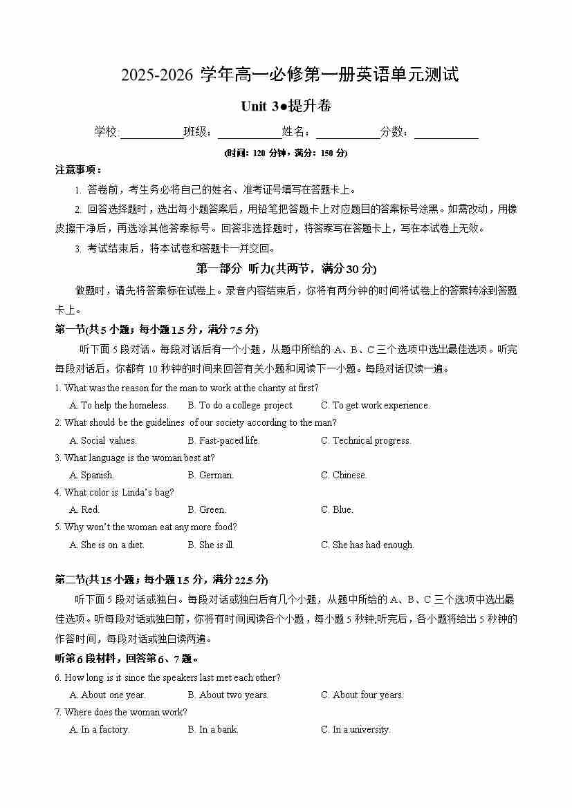 高一英语必修第一册Unit 3 单元测试·提升卷(考试版A4)