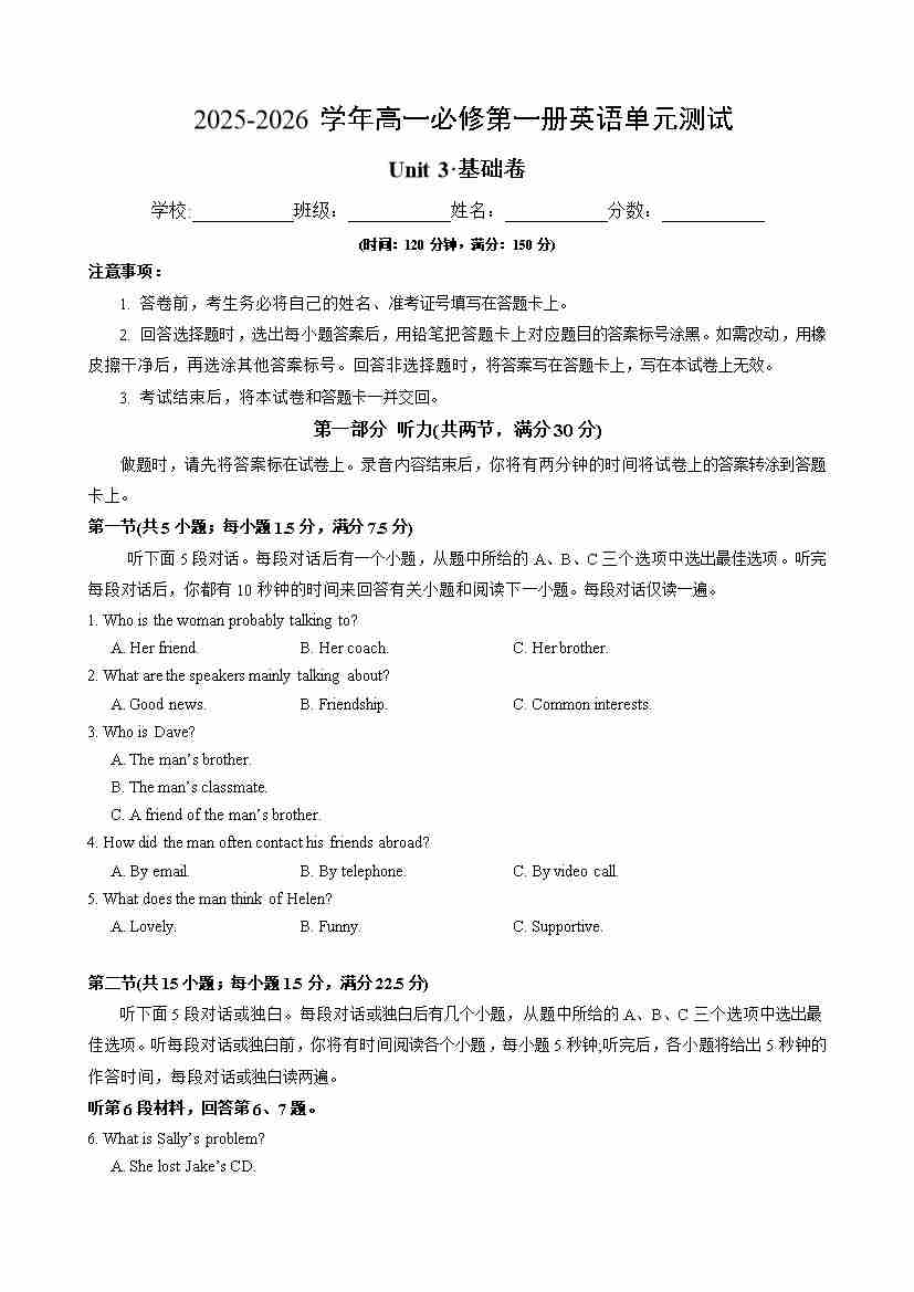 首页 > 全部 > 单元测试 > 高一英语必修第一册Unit 3 单元测试·基础卷(考试版A4)