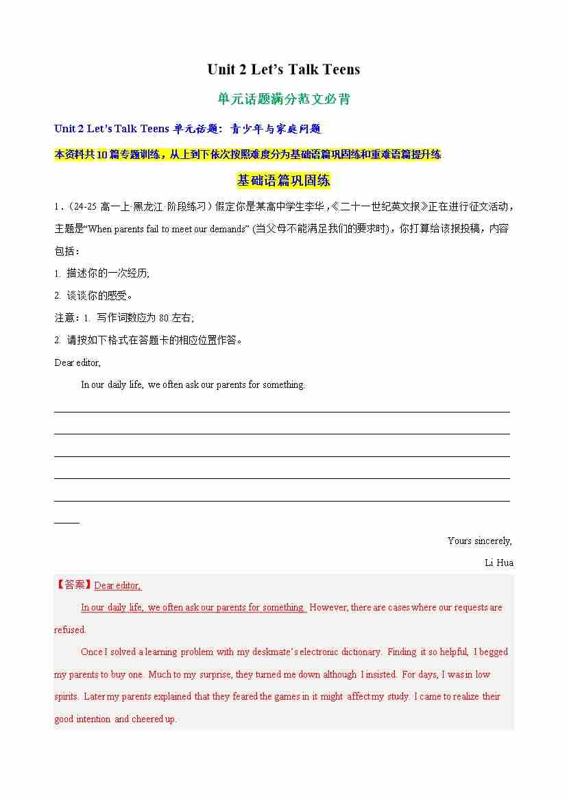 Unit 2 Let’s Talk Teens 单元话题满分范文必背(教师版)
