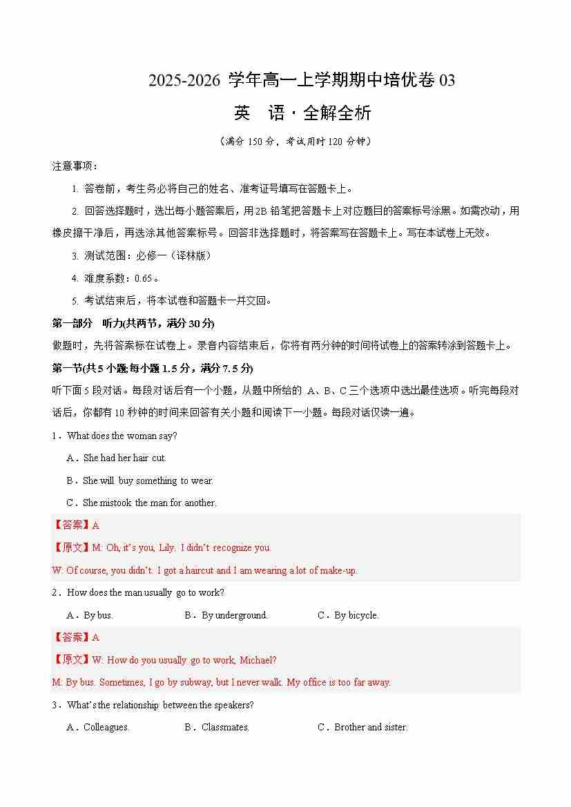 首页 > 全部 > 期中试卷 > 高一英语上学期期中培优卷03(译林版·江苏专用)(教师版)