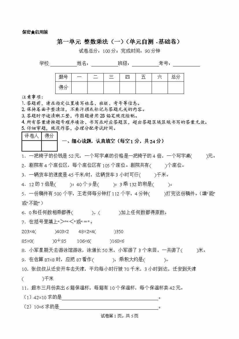 首页 > 全部 > 单元测试 > 第一单元 整数乘法(一)(单元自测•基础卷)数学北师大版三年级下册(A4版)