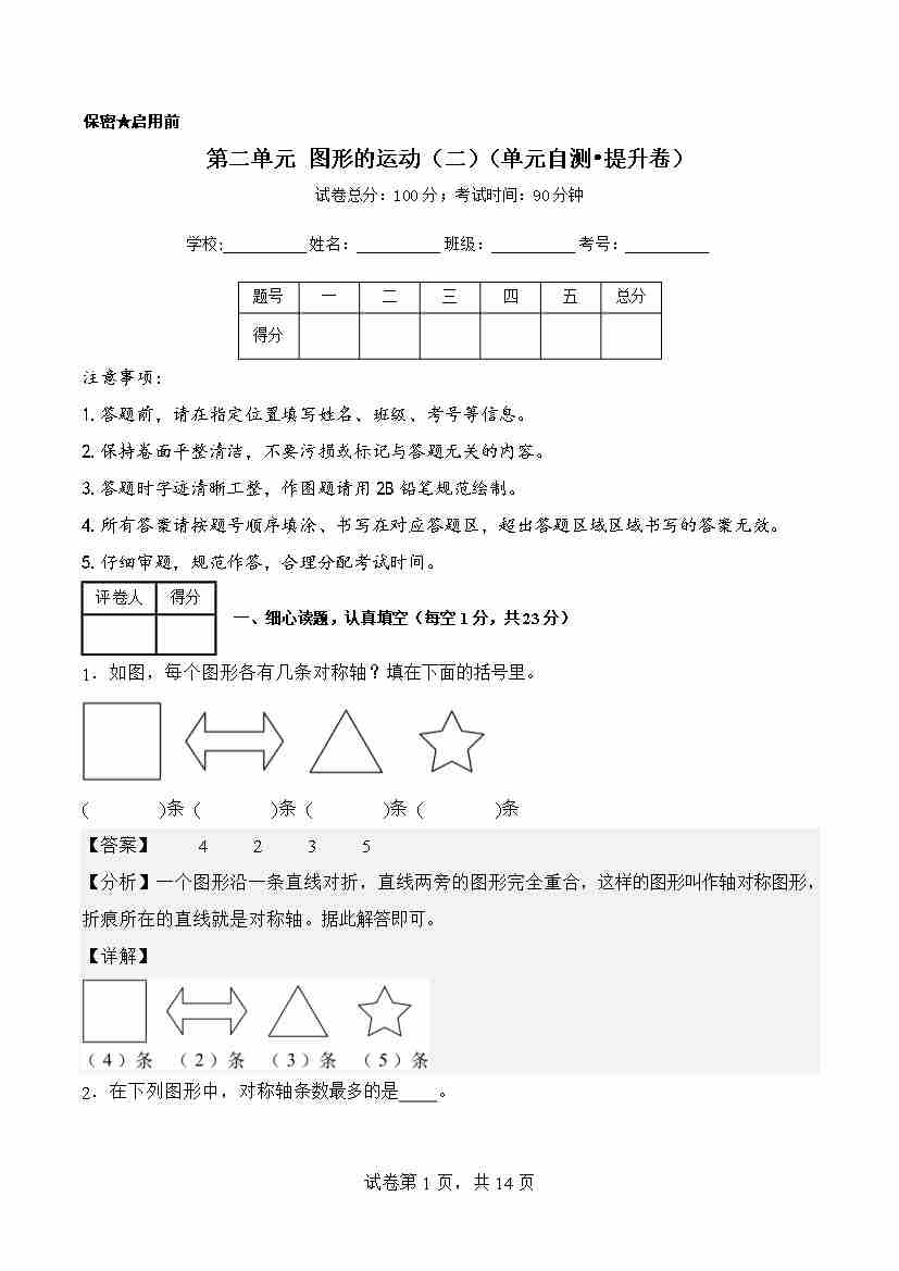 第二单元 图形的运动(二)(单元自测·提升卷)数学北师大版三年级下册(参考解析)