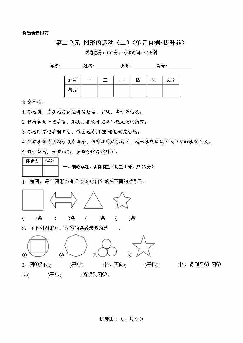 首页 > 全部 > 单元测试 > 第二单元 图形的运动(二)(单元自测·提升卷)数学北师大版三年级下册(A4版)