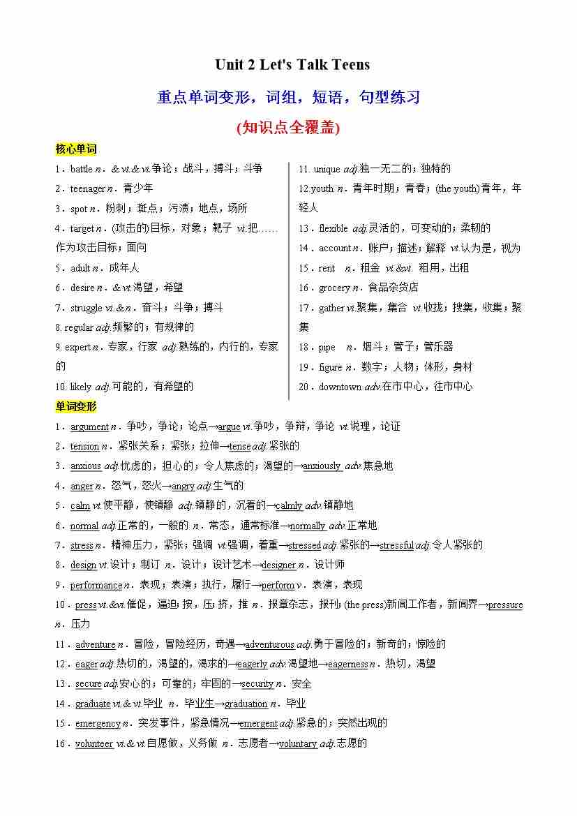 首页 > 全部 > 重难点易错 > Unit 2 Let’s Talk Teens 重点单词变形,词汇,语法,知识点复习题(教师版)