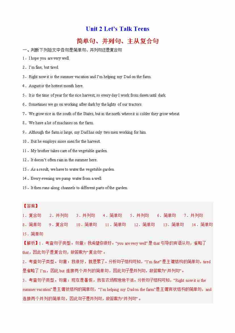 首页 > 全部 > 重难点易错 > Unit 2 Let’s Talk Teens 语法Grammar 简单句、并列句、主从复合句(教师版)