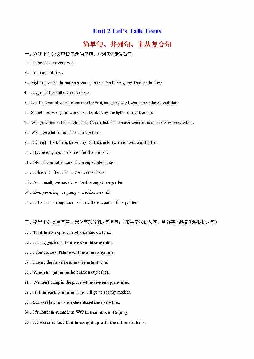 首页 > 全部 > 重难点易错 > Unit 2 Let’s Talk Teens 语法Grammar 简单句、并列句、主从复合句(学生版)
