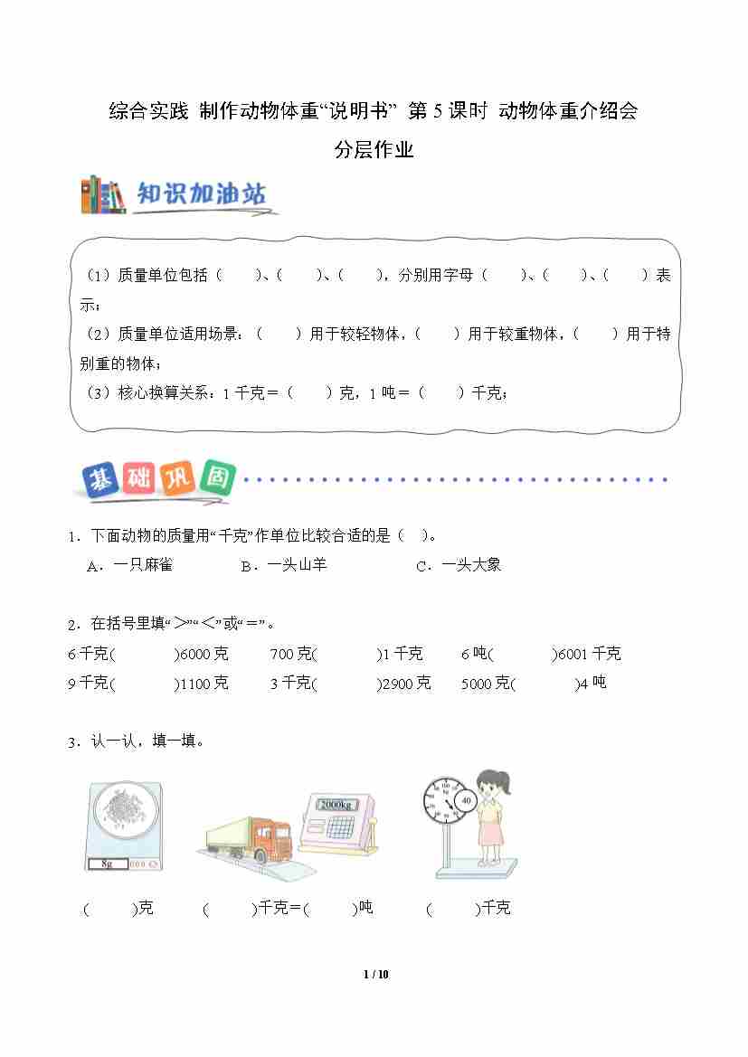 首页 > 全部 > 分层作业 > 综合实践 制作动物体重“说明书” 第5课时 动物体重介绍会(分层作业)数学北师大版三年级下册(新教材)