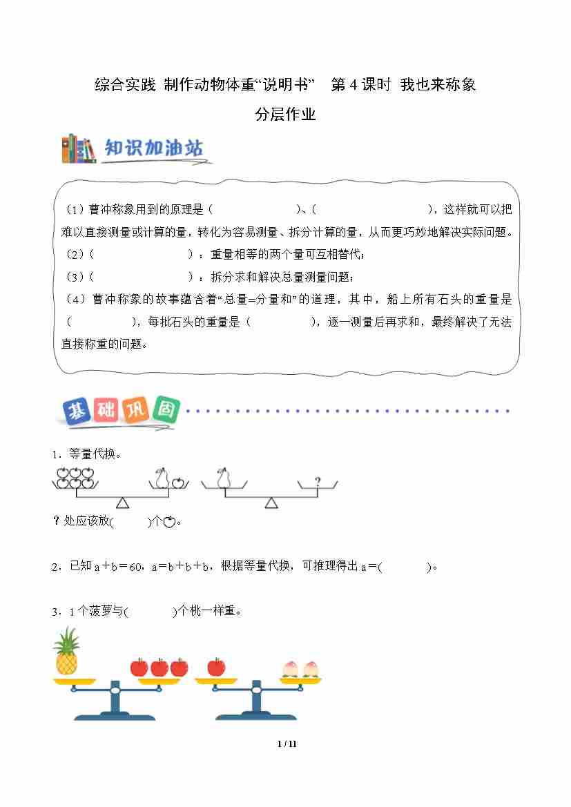 首页 > 全部 > 分层作业 > 综合实践 制作动物体重“说明书” 第4课时 我也来称象(分层作业)数学北师大版三年级下册(新教材)