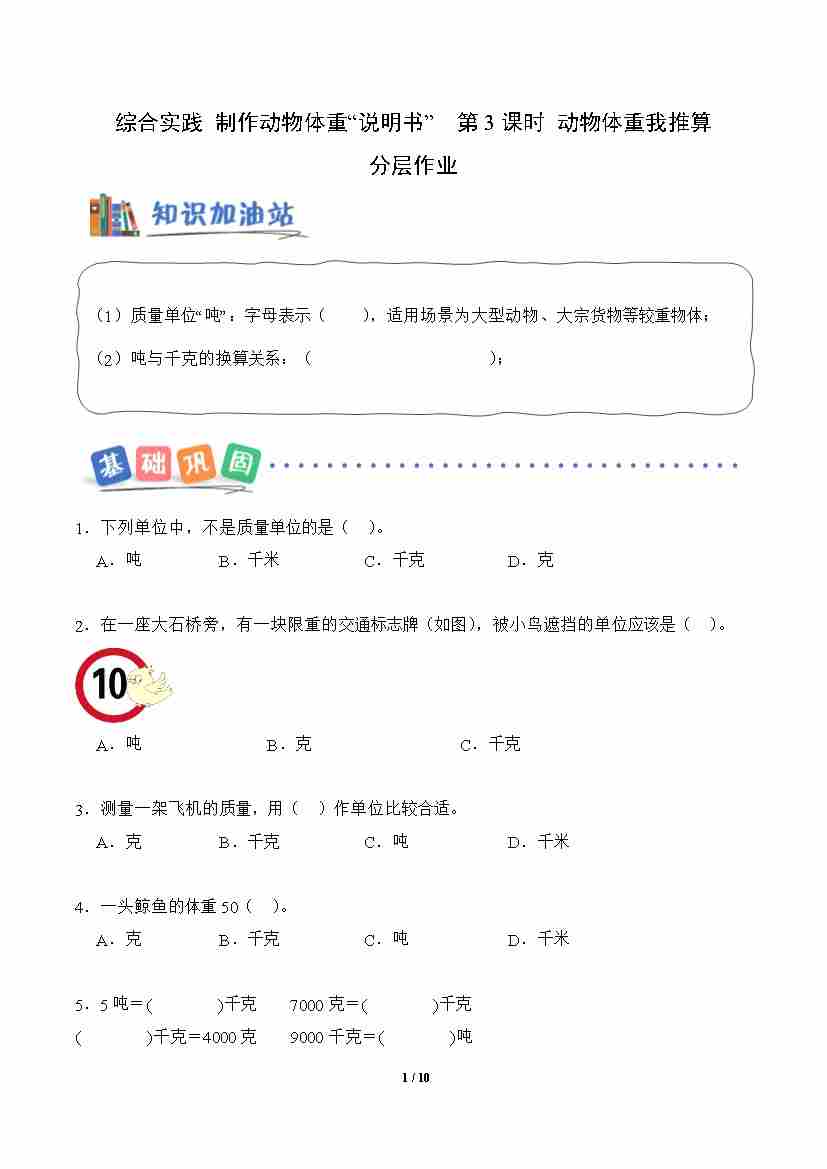 首页 > 全部 > 分层作业 > 综合实践 制作动物体重“说明书” 第3课时 动物体重我推算(分层作业)数学人北师大版三年级下册(新教材)