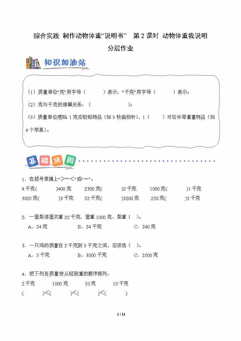 首页 > 全部 > 分层作业 > 综合实践 制作动物体重“说明书” 第2课时 动物体重我说明(分层作业)数学北师大版三年级下册(新教材)