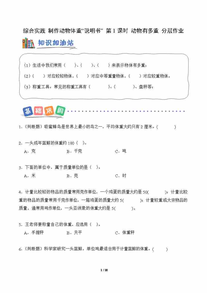 首页 > 全部 > 分层作业 > 综合实践 制作动物体重“说明书” 第1课时 动物有多重(分层作业)数学北师大版三年级下册(新教材)