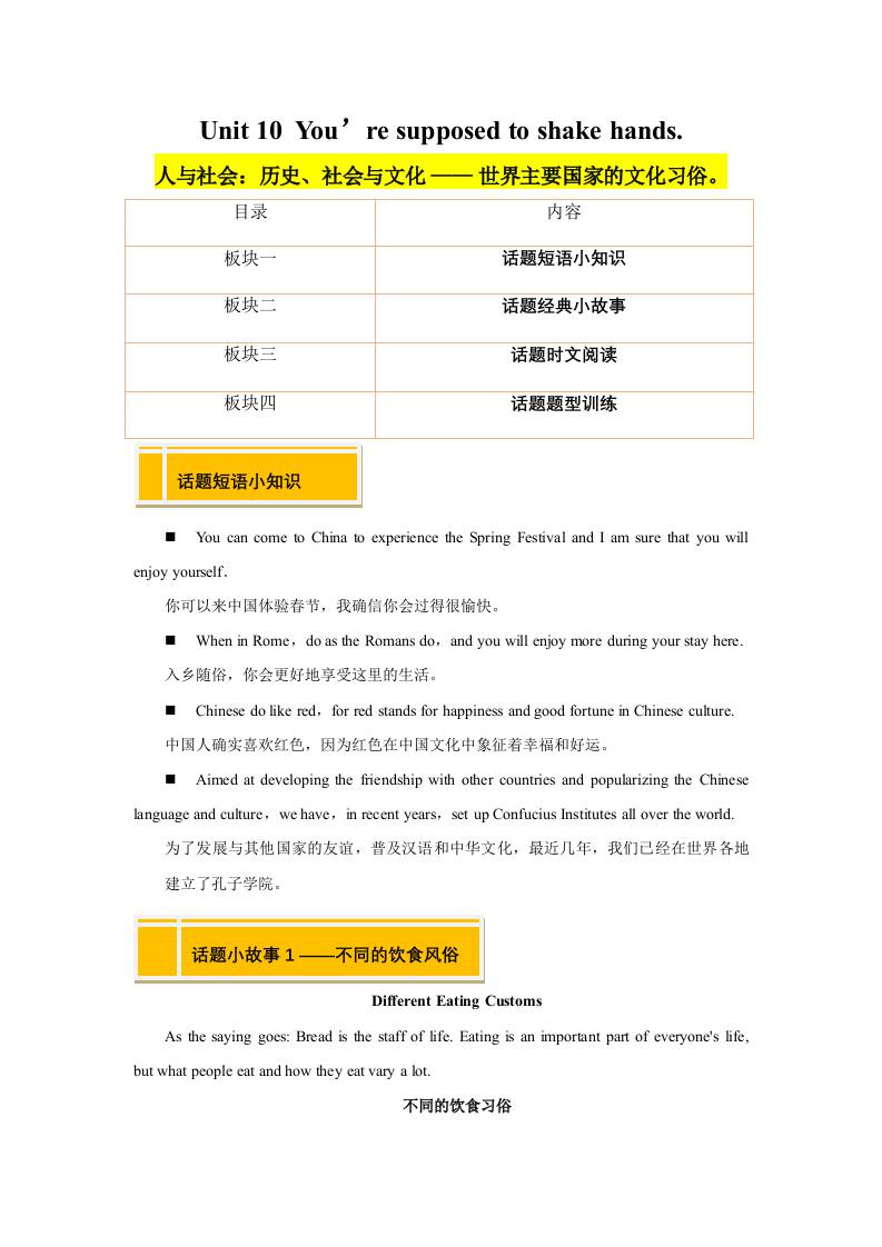 ②寒假专项培优-Unit 10 You’re supposed to shake hands. (人与社会:历史、社会与文化) (学生版)2025年九年级英语寒假衔接讲练 (人教版)