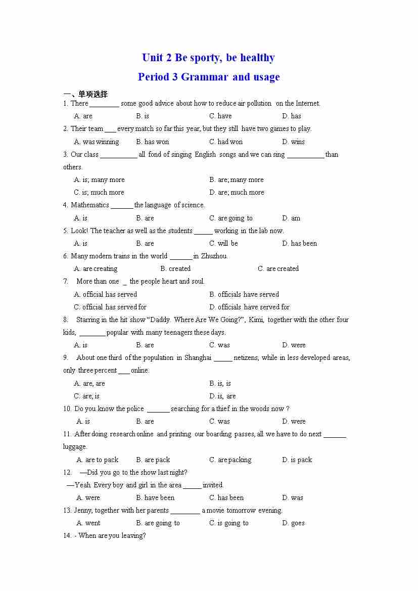 Unit 2 Be sporty, be healthy Period 3 Grammar and usage(分层练习)高一英语上学期同步精品课堂(译林版2020必修第二册)