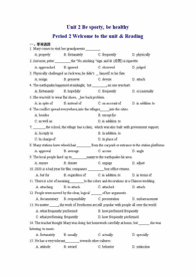 Unit 2 Be sporty, be healthy Period 2 Welcome to the unit & Reading(分层练习)高一英语上学期同步精品课堂(译林版2020必修第二册)