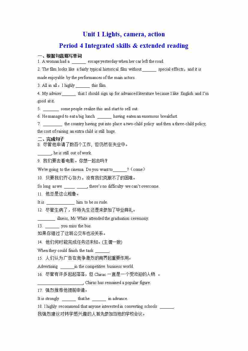 首页 > 全部 > 分层作业 > Unit 1 Lights, camera, action Period 4 Integrated skills & extended reading(分层练习)高一英语上学期同步精品课堂(译林版2020必修第二册)