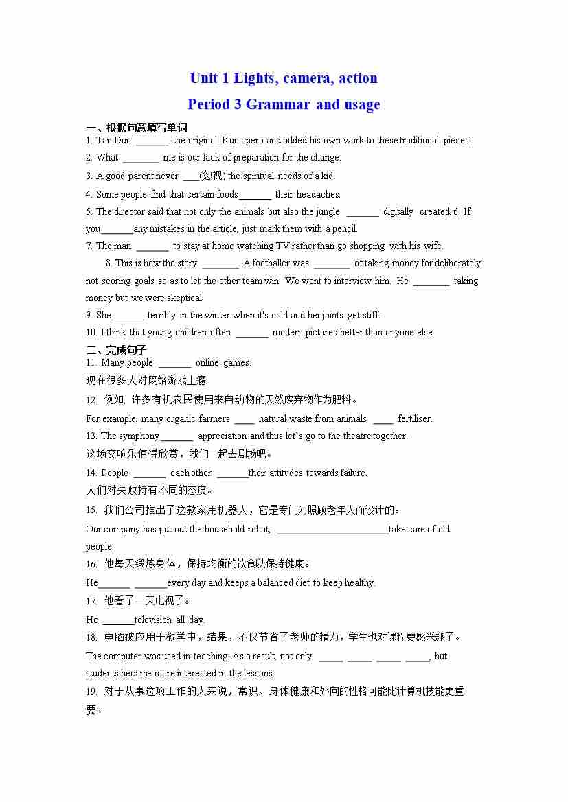 首页 > 全部 > 分层作业 > Unit 1 Lights, camera, action Period 3 Grammar and usage(分层练习)高一英语上学期同步精品课堂(译林版2020必修第二册)