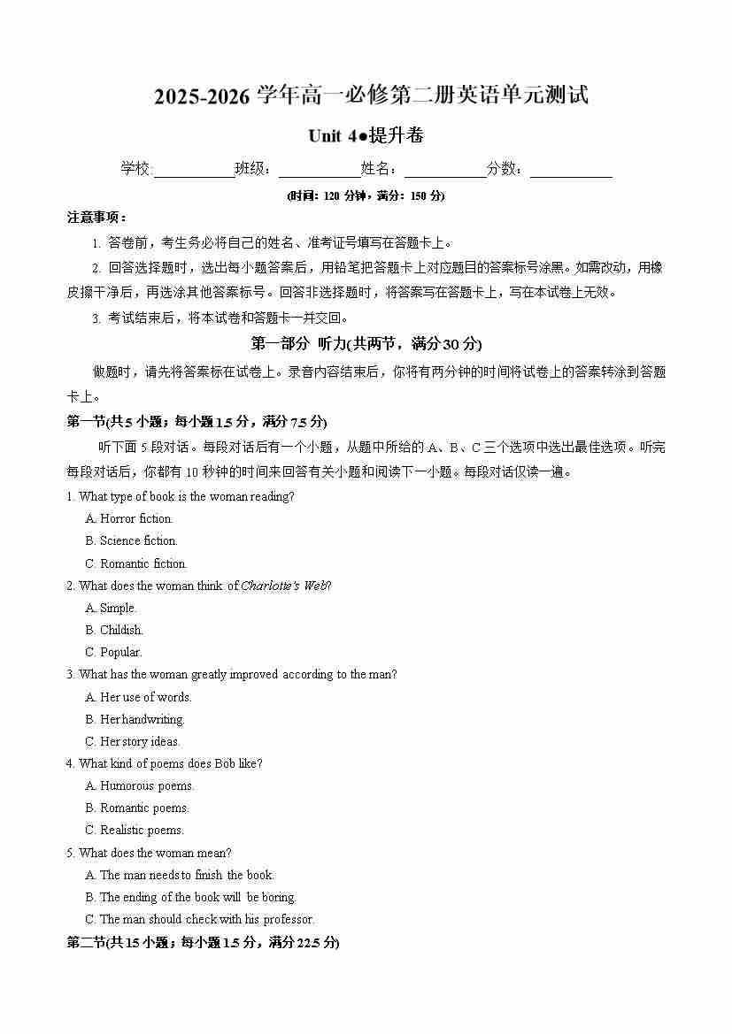 首页 > 全部 > 单元测试 > 高一英语必修第二册Unit 4 单元测试·提升卷(考试版A4)