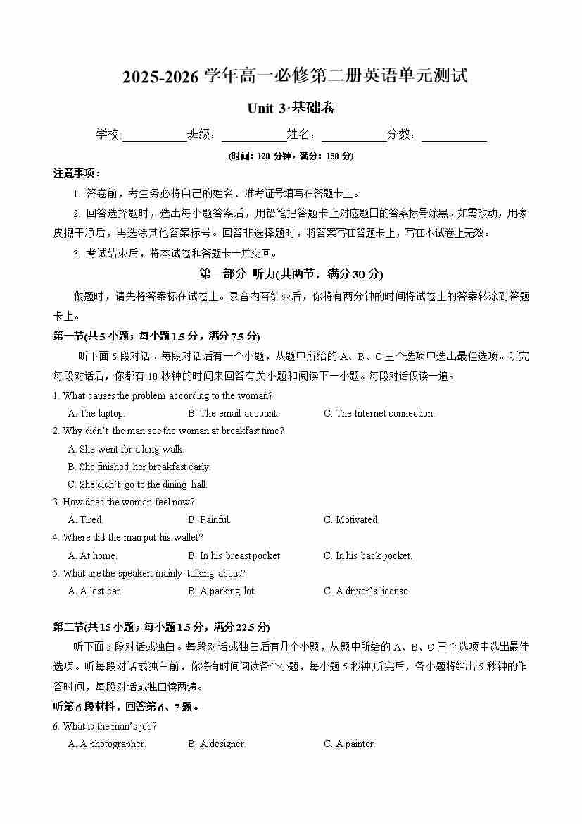 首页 > 全部 > 单元测试 > 高一英语必修第二册Unit 3 单元测试·基础卷(考试版A4)