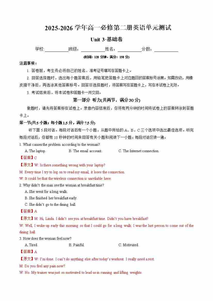 首页 > 全部 > 单元测试 > 高一英语必修第二册Unit 3 单元测试·基础卷(教师版)
