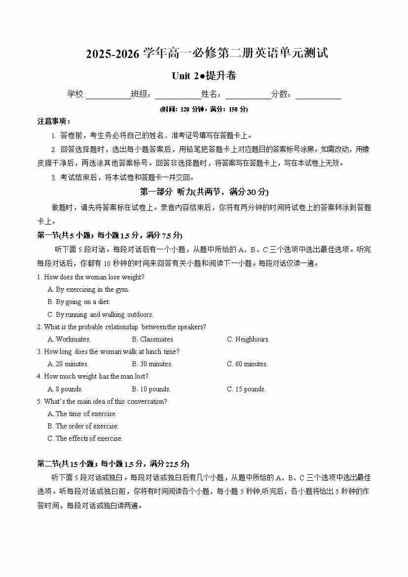 首页 > 全部 > 单元测试 > 高一英语必修第二册Unit 2 单元测试·提升卷(考试版A4)