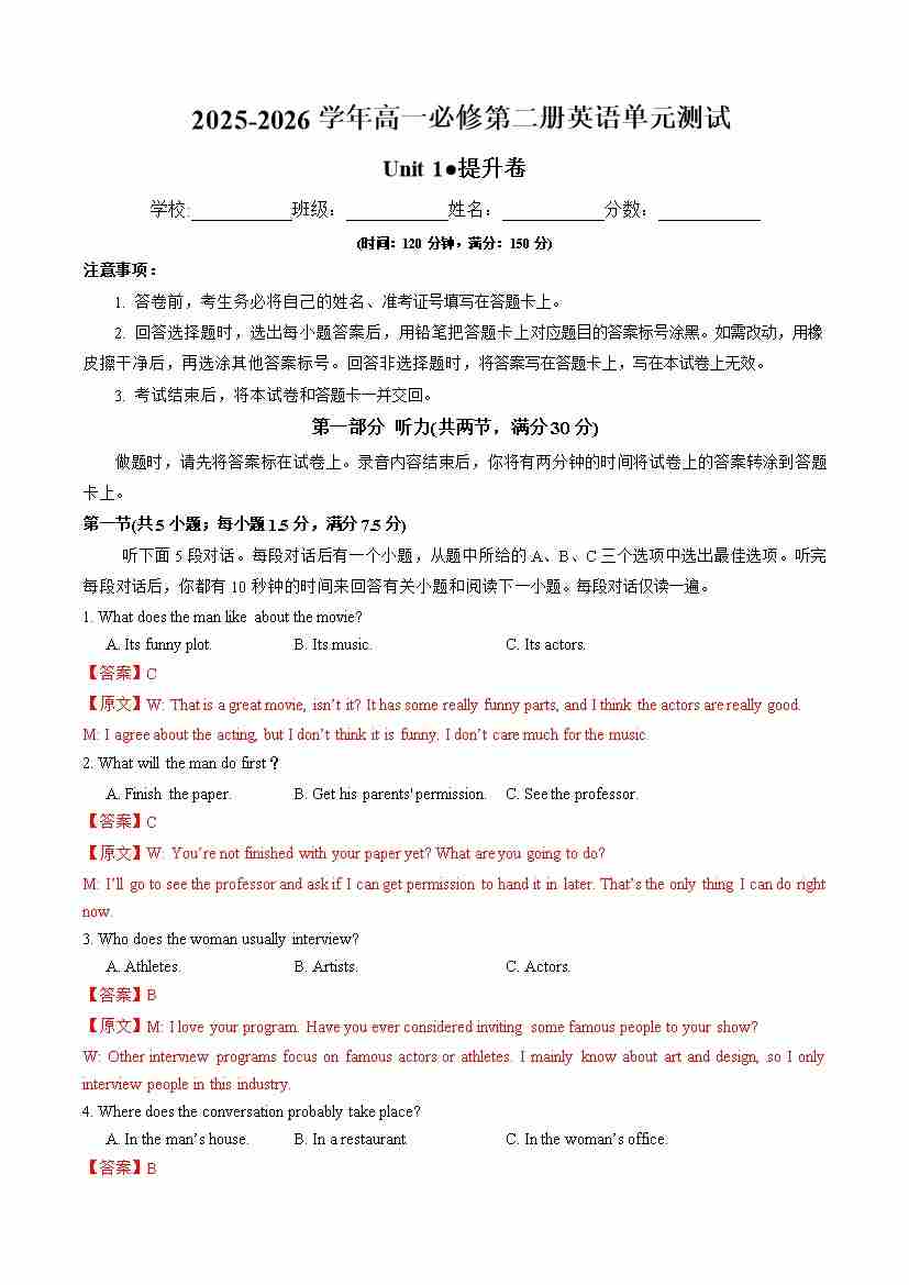 首页 > 全部 > 单元测试 > 高一英语必修第二册Unit 1 单元测试·提升卷(教师版)