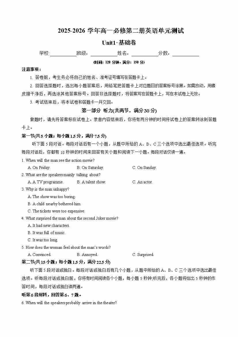 首页 > 全部 > 单元测试 > 高一英语必修第二册Unit 1 单元测试·基础卷(考试版A4)