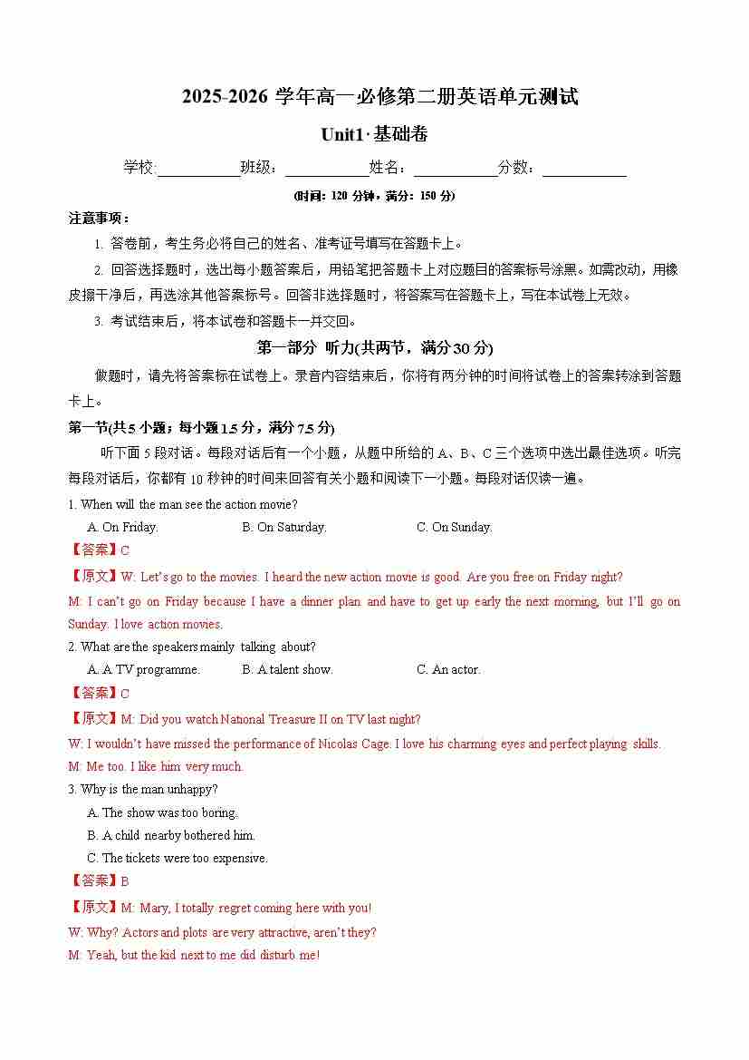 首页 > 全部 > 单元测试 > 高一英语必修第二册Unit 1 单元测试·基础卷(教师版)