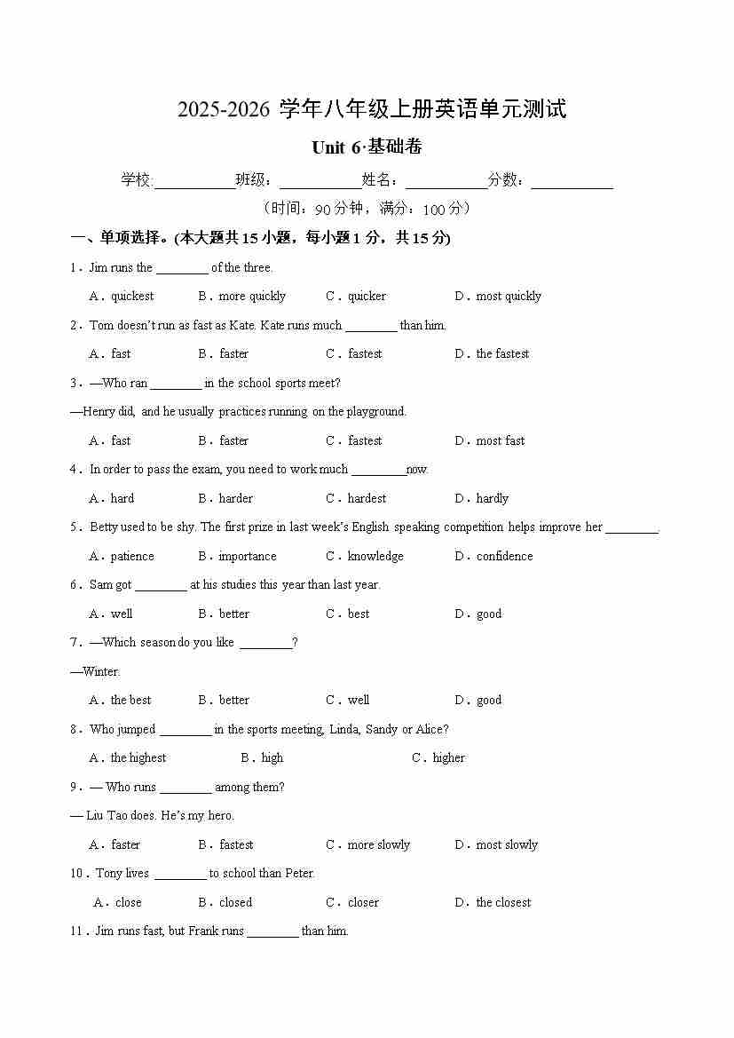 首页 > 全部 > 单元基础卷 > 八年级英语上册Unit6单元测试·基础卷(考试版A4)