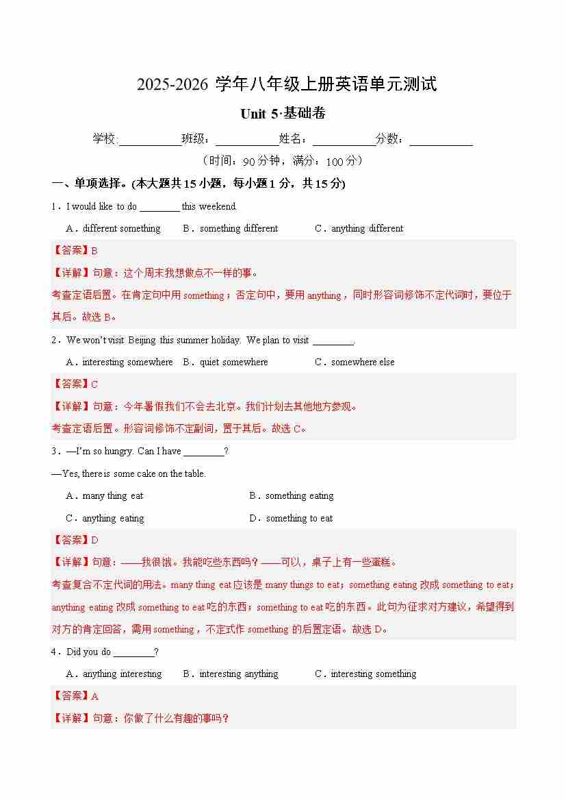 首页 > 全部 > 单元基础卷 > 八年级英语上册Unit5单元测试·基础卷(解析版)