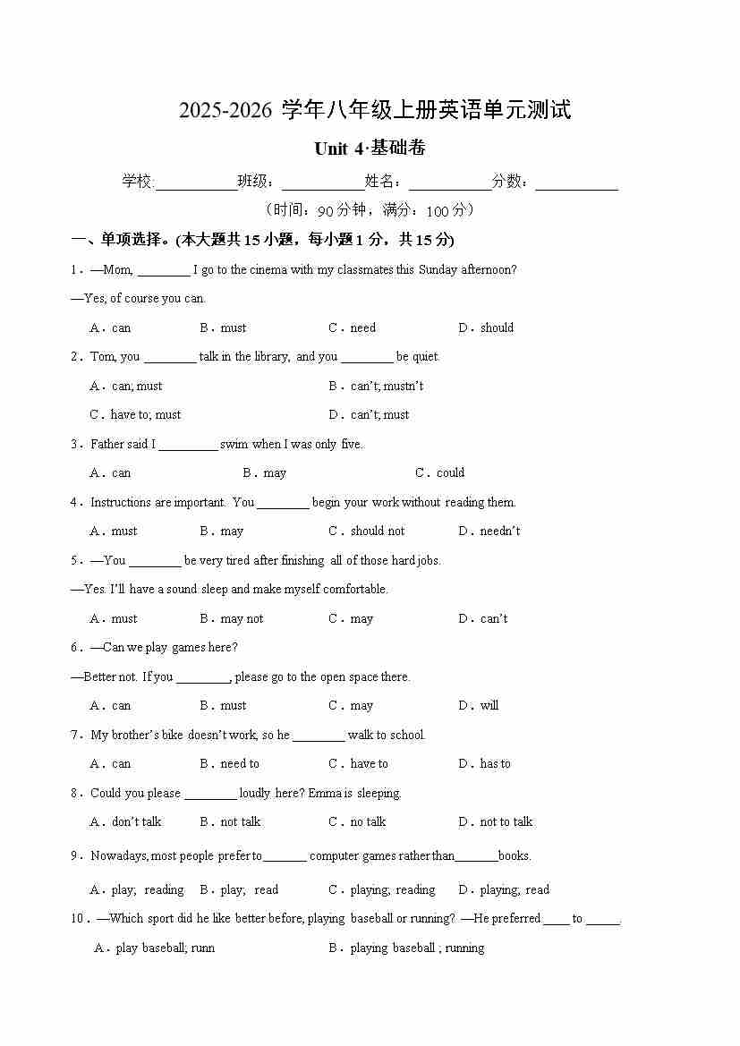 八年级英语上册Unit4单元测试·基础卷(考试版A4)