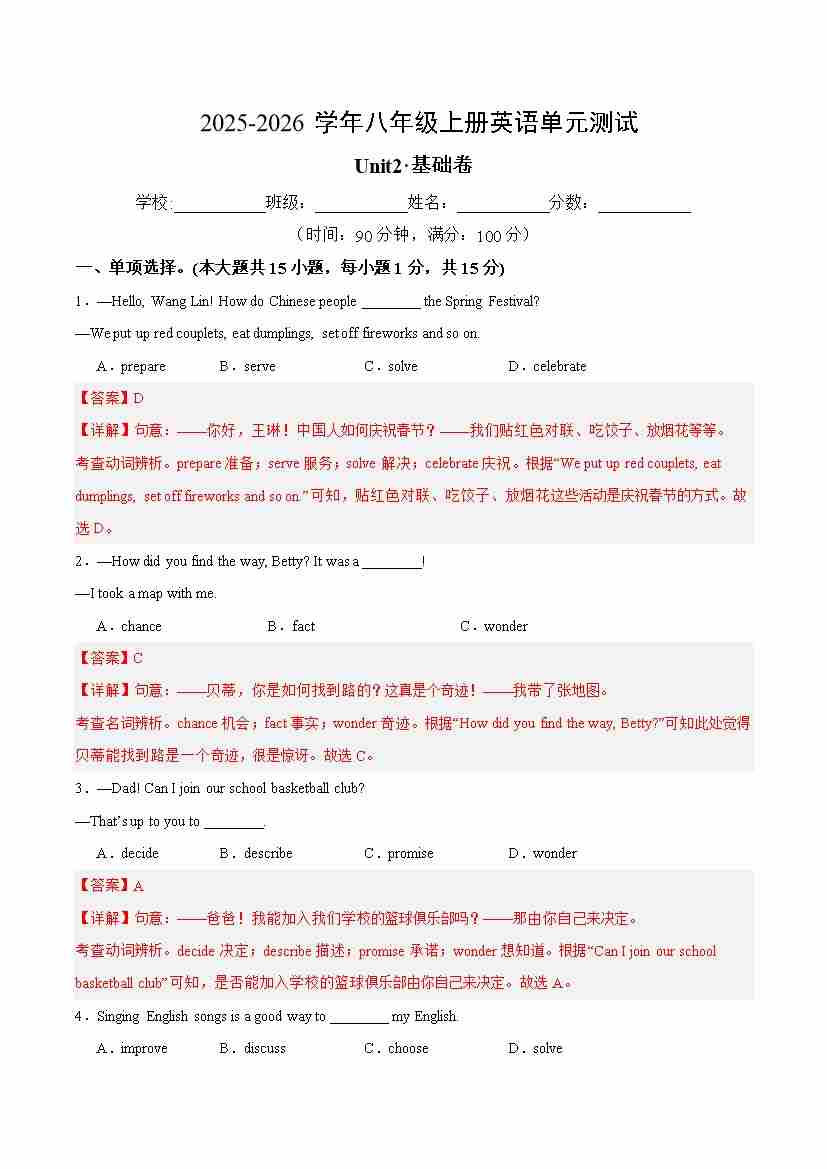 八年级英语上册Unit2单元测试·基础卷(解析版)