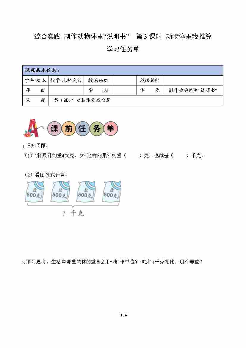 首页 > 全部 > 学习任务单 > 综合实践 制作动物体重“说明书” 第3课时 动物体重我推算(学习任务单)数学北师大版三年级下册(新教材)
