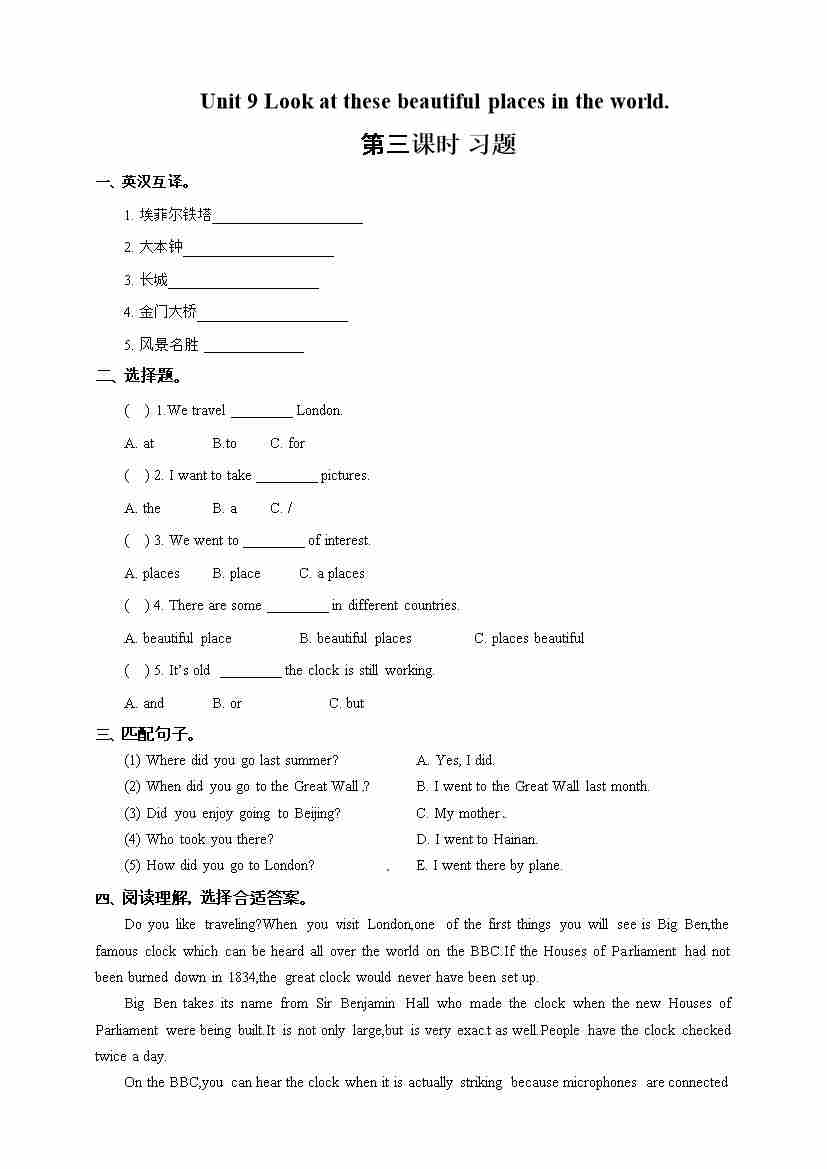首页 > 全部 > 同步练习 > 六年级下册英语一课一练-Unit 9 Look at these beautiful places in the world 第三课时 湘少版三起(word版,含答案)
